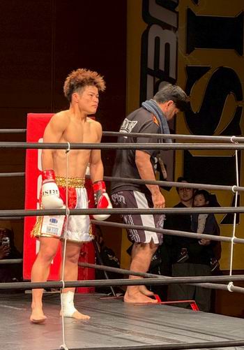 1R:昌也選手は軽くフットワークを踏みながら様子を伺い、早いウィービングから、レバーブロー、左フック、右ストレートにつなぐと、再びウィービングしながら、間合いをはずす。スピーディーな右ローキックも効果的だ。対する丸山選手は、ノーモーションの右ストレートと膝蹴りで迎え撃つ。このラウンドは有効打の数で上回った昌也選手が取る。 2R:リズム良くウィービングを使う昌也選手がペースを掴むと、抜群のタイミングでバックブローを決めて、ダウンを奪う。立ち上がった丸山選手を正面から追い込むが、丸山選手の左フックからの右ストレートを浴びて、まさかのダウンを喫する。ここは立ち上がった昌也選手だったが、今度は右アッパーから右ストレートを被弾し、再度ダウンしたところで、レフリーが試合を止めた。 この試合に向けて並々ならぬ努力をしてきただけに、悔しさを抑えきれない昌也選手だったが、進化した姿をみせてくれた。稽古をともにした道場の仲間は、彼の努力が痛いほど分かる。まずはゆっくり体を休めて、次の目標を見定めてもらいたい。
